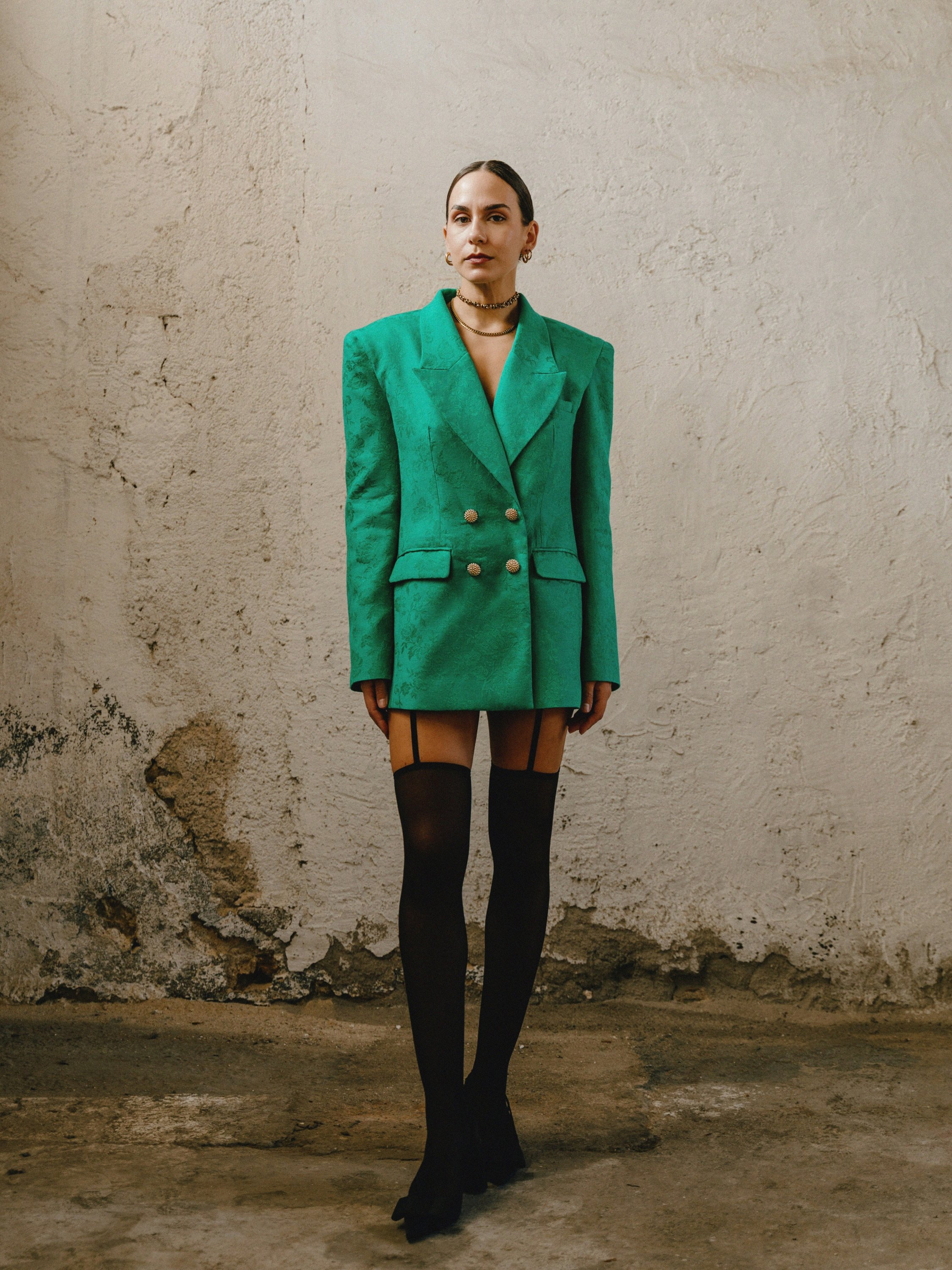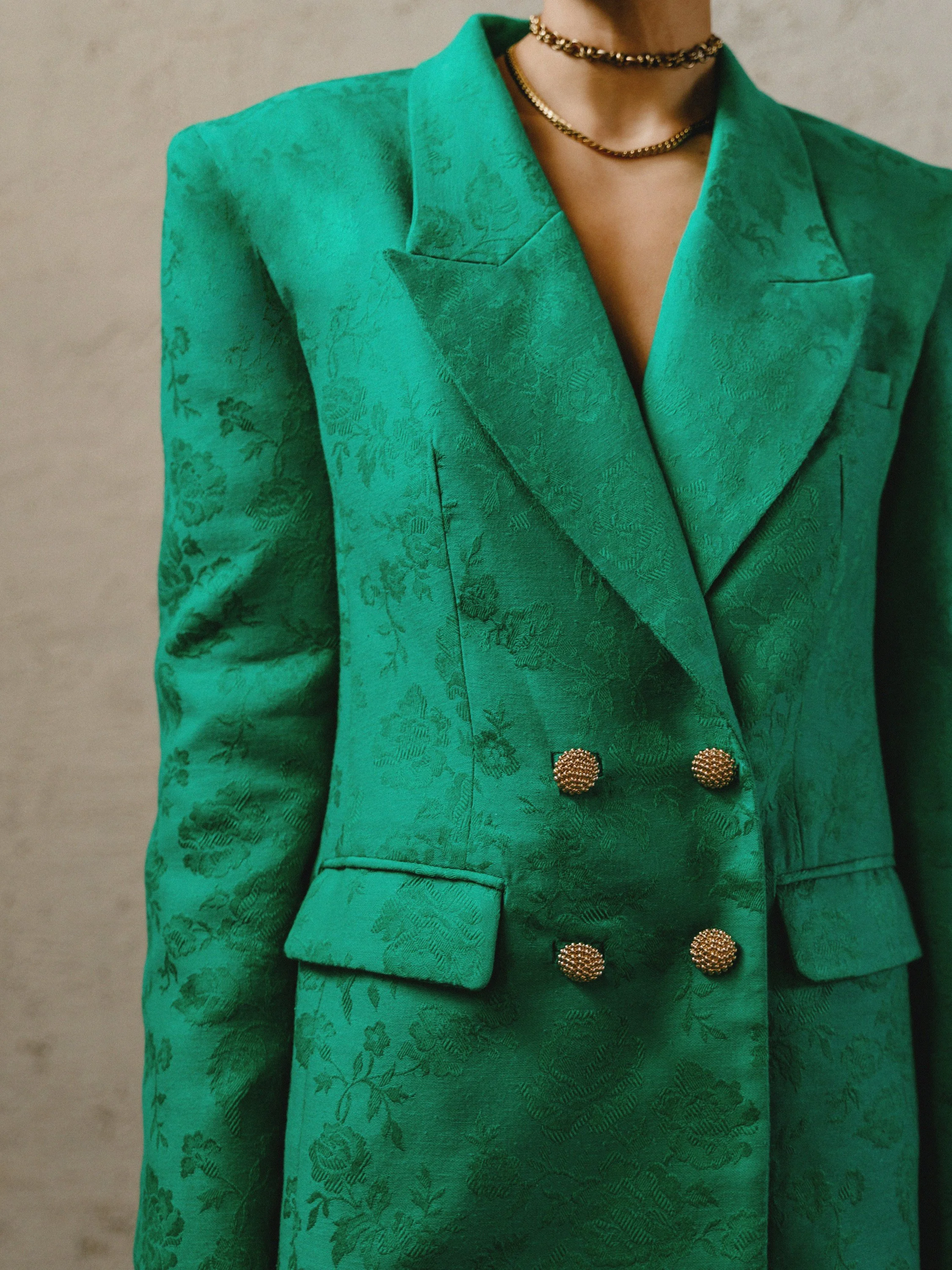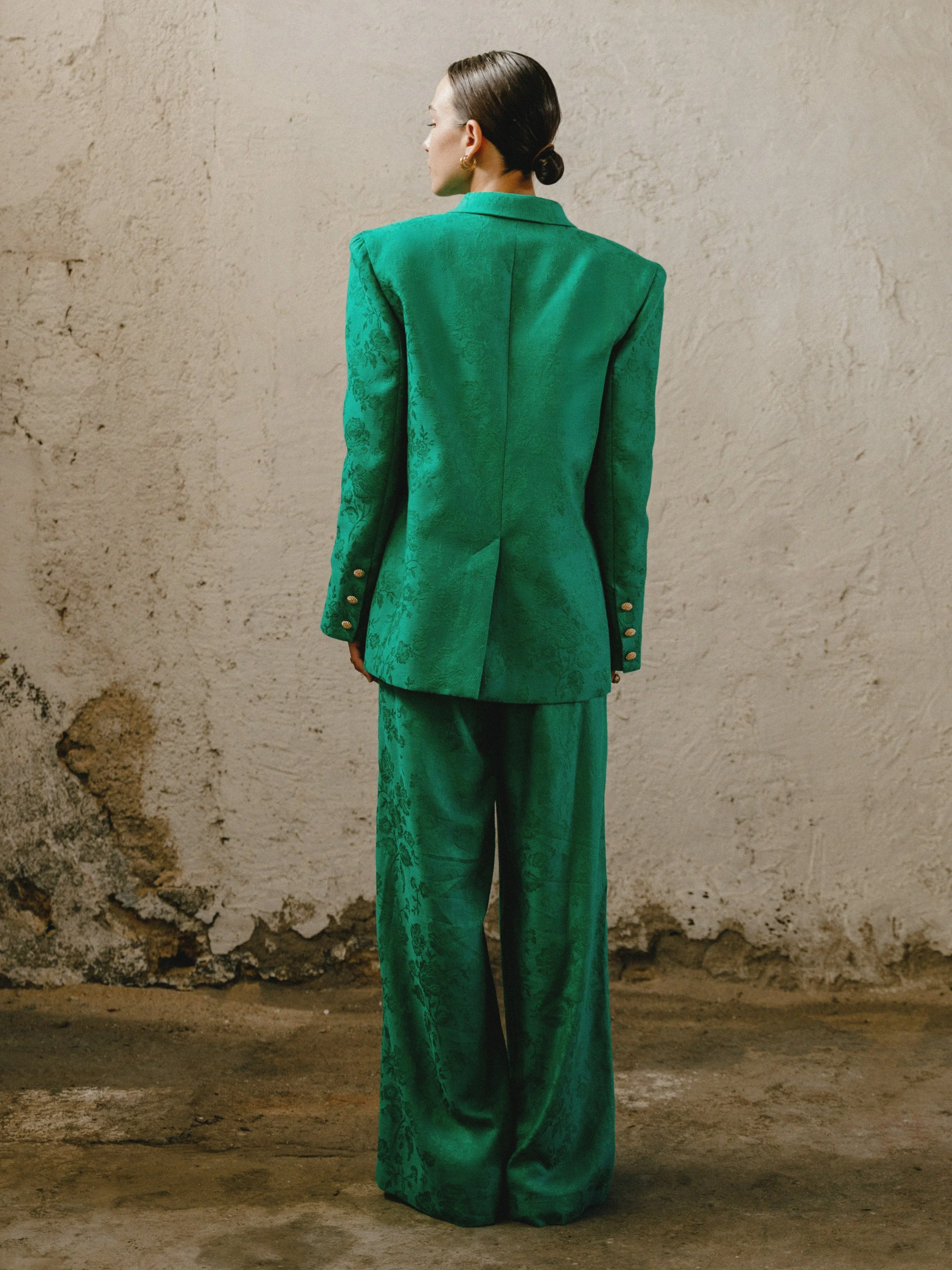 has a slim fit and fastens with dressed buttons.